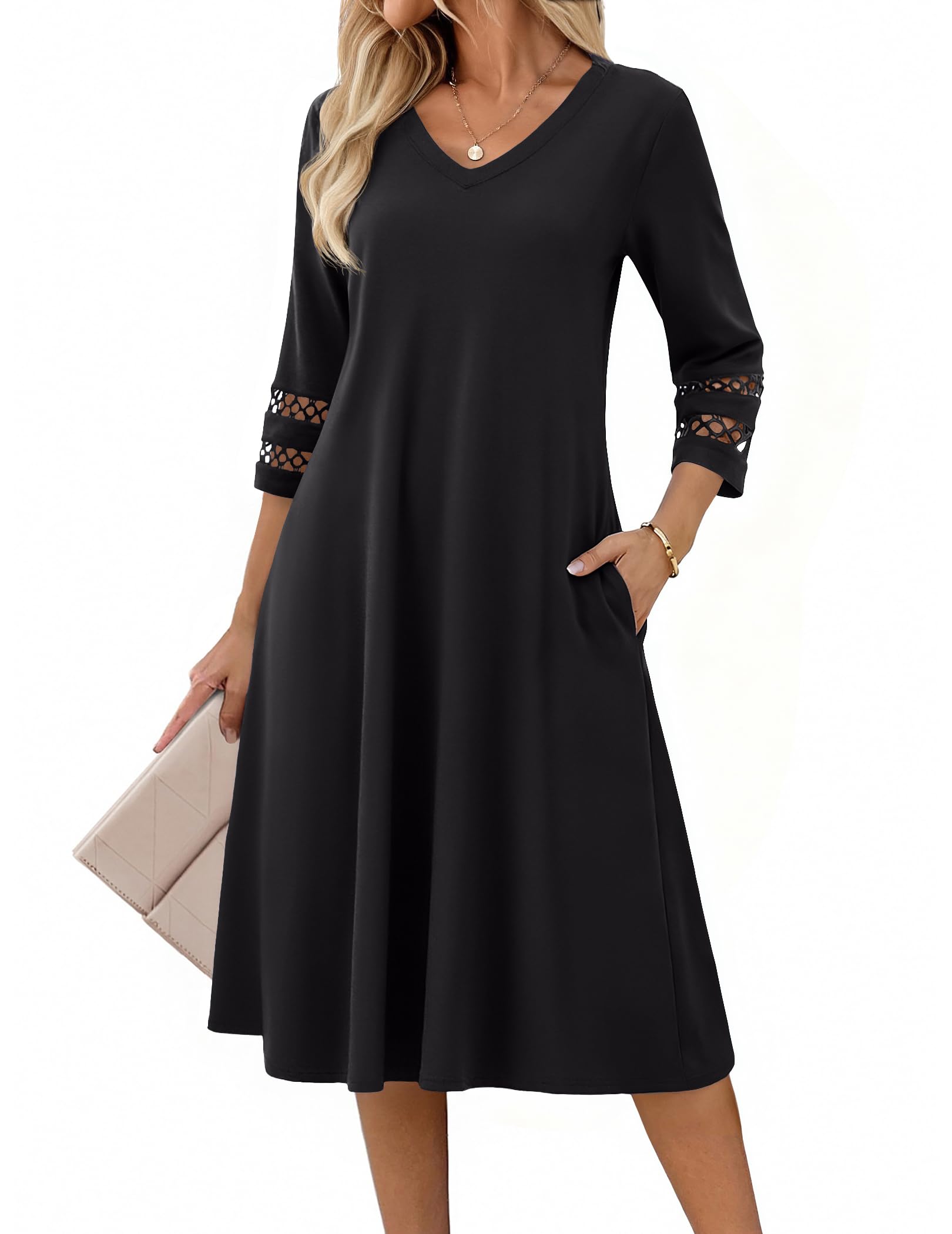 Sommerkleid Damen Elegant 3/4 Arm Midikleid Spitzenärmeln Tunikakleid A Linien Kleid mit Taschen V-Ausschnitt Blusenkleid Freizeitkleid