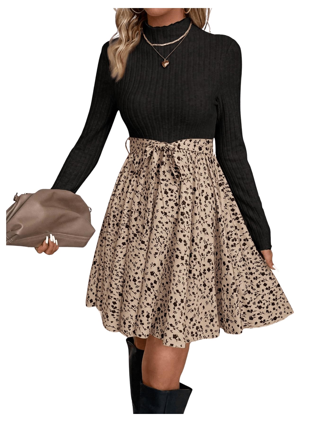 Langarm Kleid Damen Elegant A Linie Kleid Mit Blumen Strickkleid Winter Kleid Mit Gürtel Farbblock Kleid Blusenkleid Mit Stehkragen