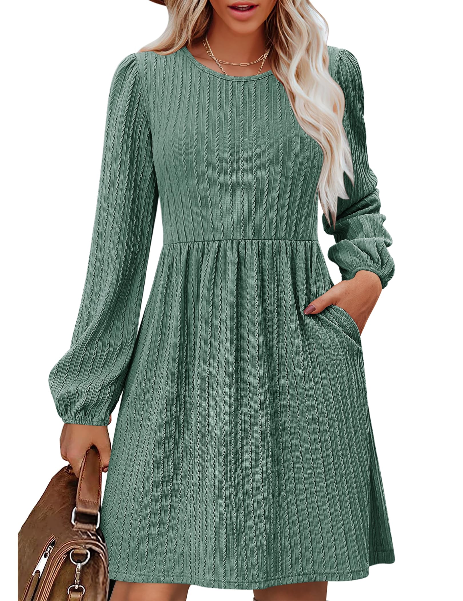 Kleid Damen Langarm Herbstkleid Elegant A-Linie Winter Kleider Rundhals Lockeres Strickkleid Knielang Tunikakleid mit Taschen